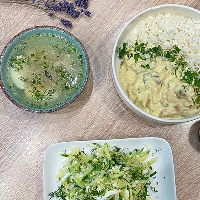 Бульон с птицей и яйцом (куриный бульон от шефа, куриное филе, яйцо, специи, зелень), курица карри с грибами (красные и белые кусочки птицы, рис, грибы, сливки, зелень, специи) и гарнир на выбор, салат из Малиновки (свежая капуста и огурец, вареное яйцо, масло растительное, зелень, специи).