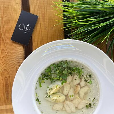 Куриный бульон от шефа, куриное филе, яйцо, специи, зелень.