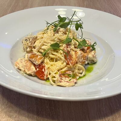 Итальянская паста тальятелле, кусочки лосося и томата, сливочный авторский соус.