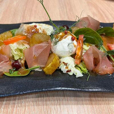 Микс салатов, груша карамелизированная, прошутто, сырные шарики, соус, микрозелень.