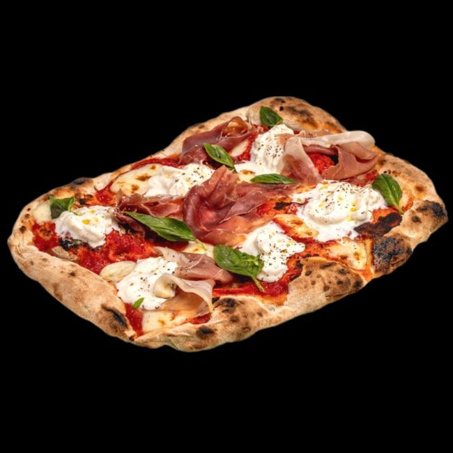 Заказать Тесто ,соус цезарь ,ветчина прошутто, моцарелла, руккола, лук зеленый.