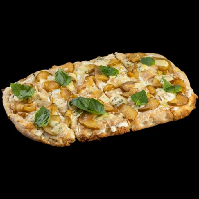 Заказать Тесто, белый соус, моцарелла, дорблю, бекон, груша, руккола.