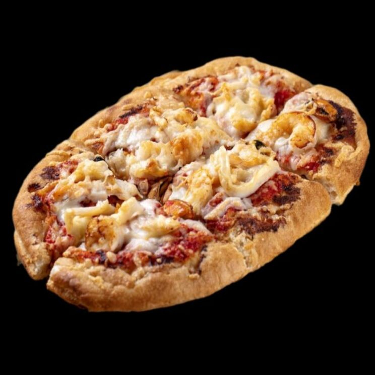 Заказать Тесто, белый соус, моцарелла, творожный сыр, коктейль из морепродуктов, помидор черри, руккола.