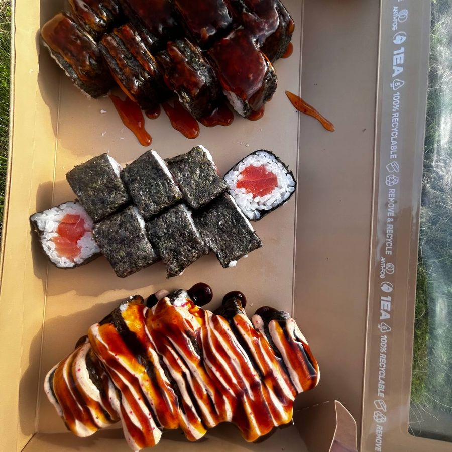 Горячий с лососем терияки, запеченный с мидиями, запеченный с лососем. БЕСПЛАТНО к сету - соевый соус 1шт, имбирь 1шт, васаби 1шт.