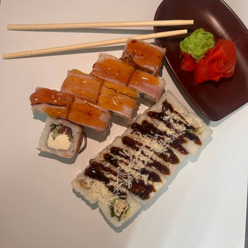 Заказать Ролл в опаленном беконе (рис, нори, сыр творожный, помидор, огурец, соус Чили). Цезарь с курицей (рис, рисовая бумага, соус белый, курица, салат, пармезан). БЕСПЛАТНО к сету - соевый соус 1шт, имбирь 1шт, васаби 1шт.