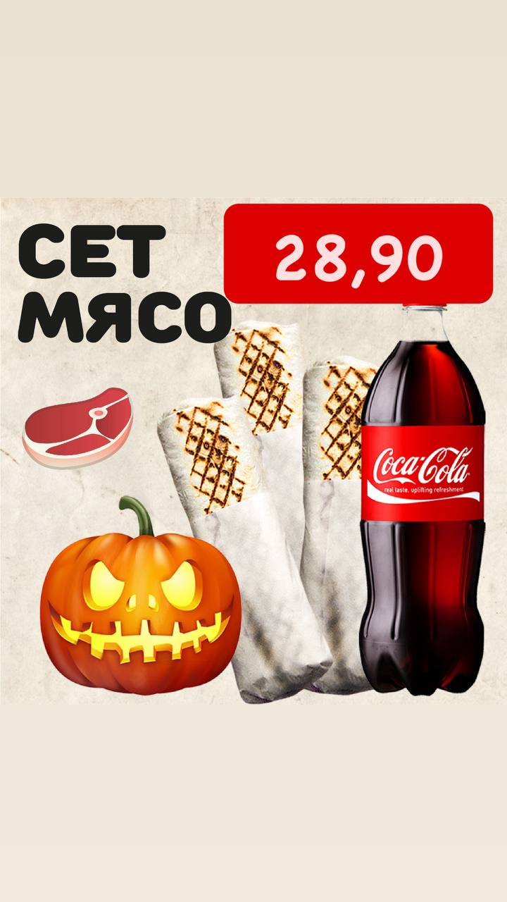 В сет входит: шаурма мясная большая 1шт, Шаурма охотничья большая 1шт, Шаурма кинг большая 1шт, Кока-кола 1.5л