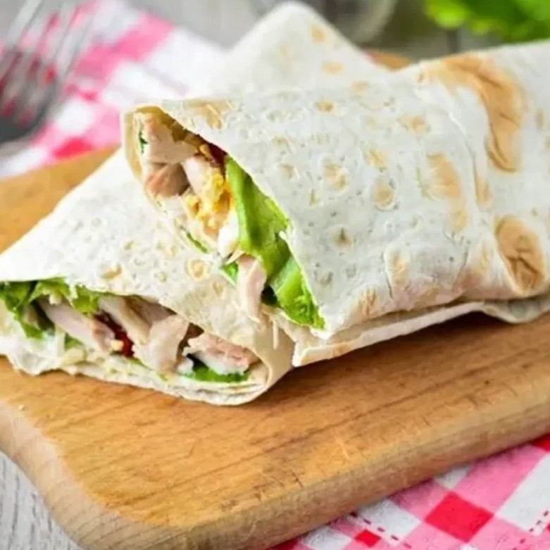 Соус фирменный, капуста, томат, сыр, куриное филе, чесночный соус.