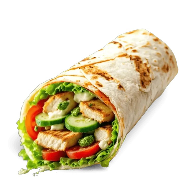 Мясо куриное, лаваш, капуста, морковь по-корейски, томат, огурец, чесночный соус, кетчуп.