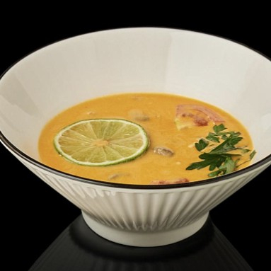 Курица, петрушка, томат, шампиньоны, кокосовое молоко, куриный бульон, паста том кха, паста том-ям, лайм.