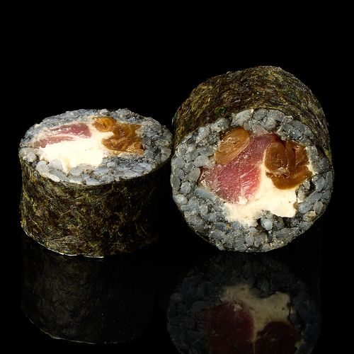 Рис, тунец, маринованная тыква Пампио, сыр творожный, соус Васаби.