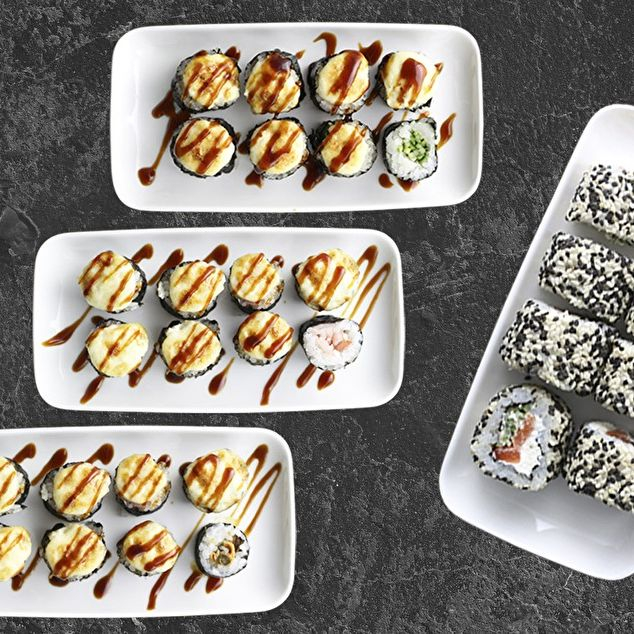 Филадельфия с огурцом, Калифорния с лососем, Темпура с креветками и мидиями, Сливочный бонито, Сливочный Хоккайдо с лососем, Горячий Канада с лососем, Горячий Хоккайдо с креветками.