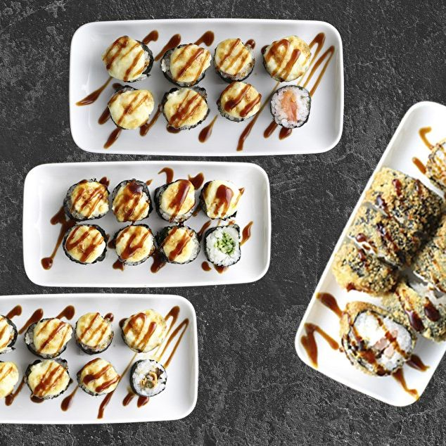 Канада с Лососем Терияки, Горячий Хоккайдо с Лососем Терияки, Темпура с Лососем Терияки и огурцом.