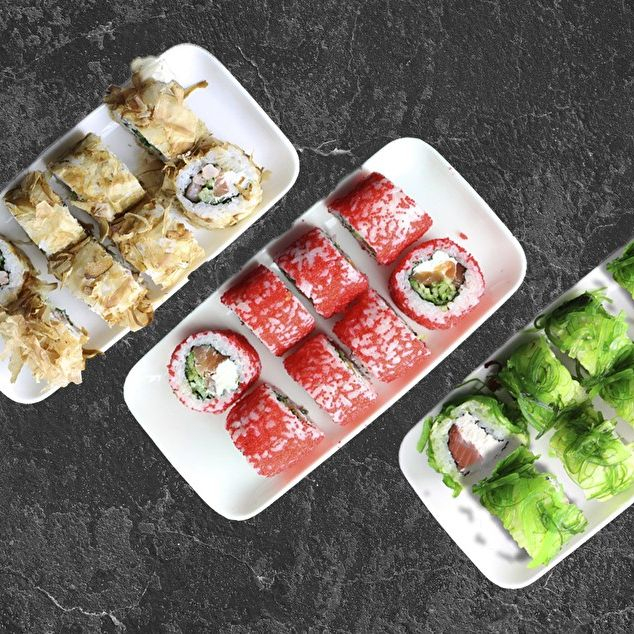 Грин с лососем, Калифорния с лососем, Бонито, Канада с лососем, Хоккайдо со снежным крабом, Горячий маки ролл с мидиями, Горячий маки ролл с креветками, Горячий маки ролл с огурцом.