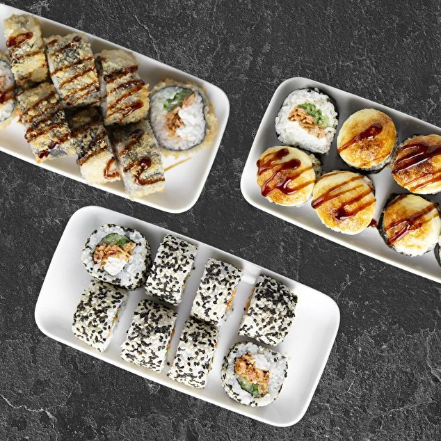 Филадельфия с огурцом, Калифорния с лососем, Темпура с креветками и мидиями, Сливочный бонито, Сливочный Хоккайдо с лососем, Горячий Канада с лососем, Горячий Хоккайдо с креветками.