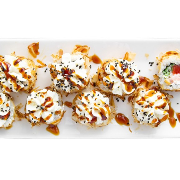 Королевские креветки, огурец, рис, крем чиз, кранч, нори.