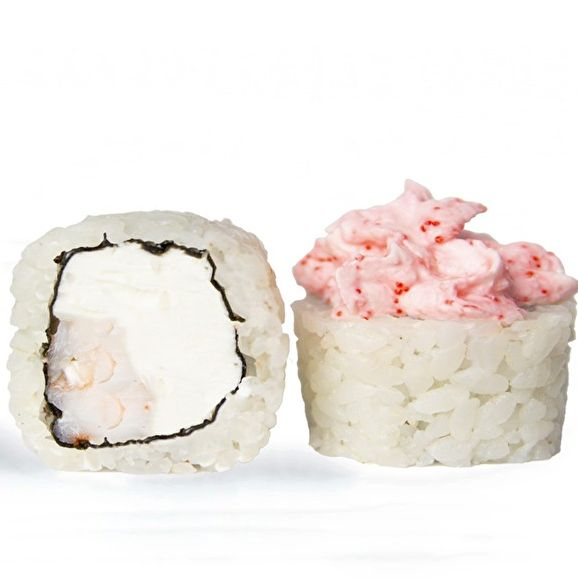 Королевские креветки, Лава крем, крем чиз, рис, нори.