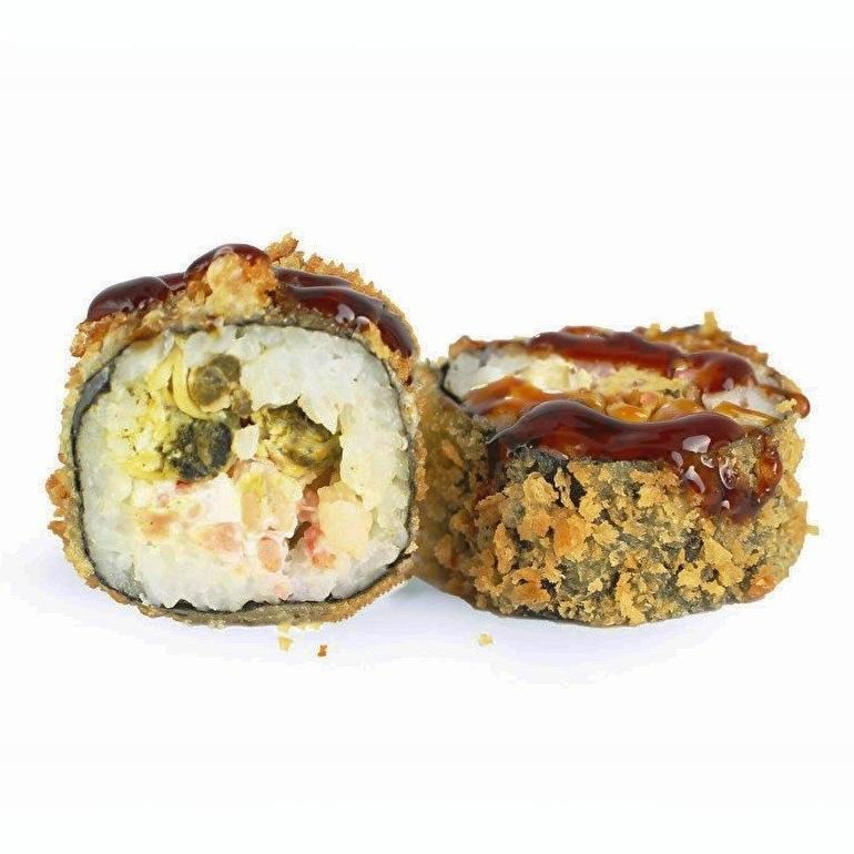 Заказать Креветки, мидии, крем чиз, панировка, рис, нори, унаги соус.