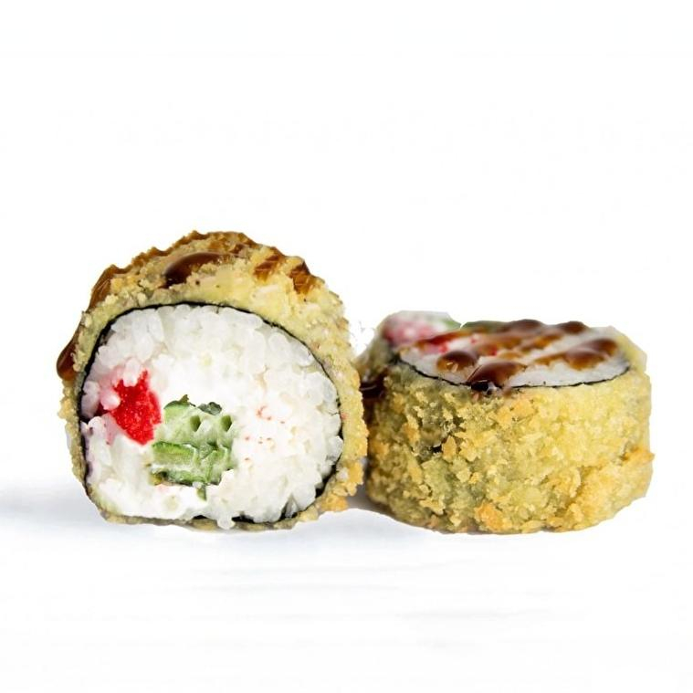 Заказать Снежный краб , икра масаго, крем чиз, панировка , огурец, рис, нори, унаги соус.