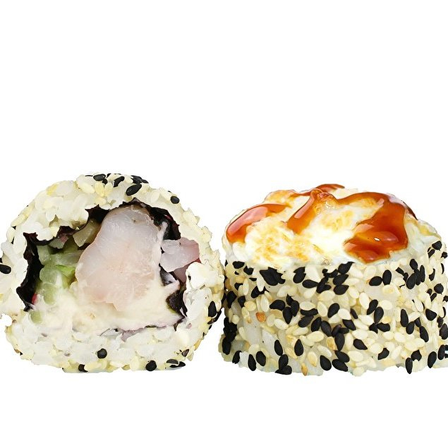 Заказать Королевские креветки, крем-чиз, нори, кунжут, рис, сыр, унаги соус.