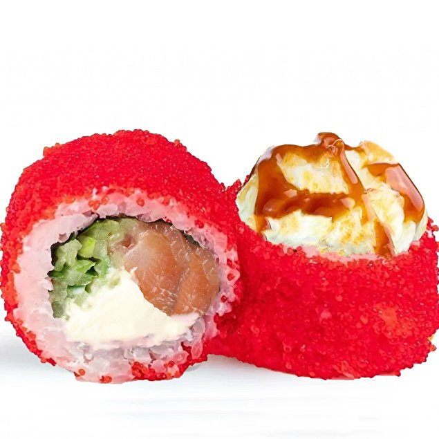 Заказать Лосось слабосоленый, крем-чиз, огурец, нори, икра масаго, рис, сыр, унаги соус.