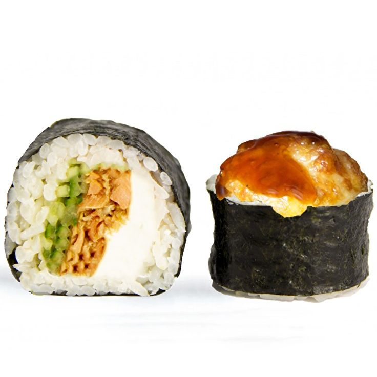 Лосось обжаренный в соусе терияки, крем чиз, огурец, сыр, рис, нори.
