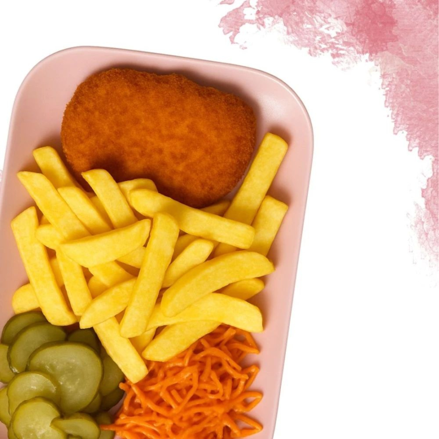 Кордон Блю, бельгийский картофель фри XL, маринованная морковь, маринованный огурец.