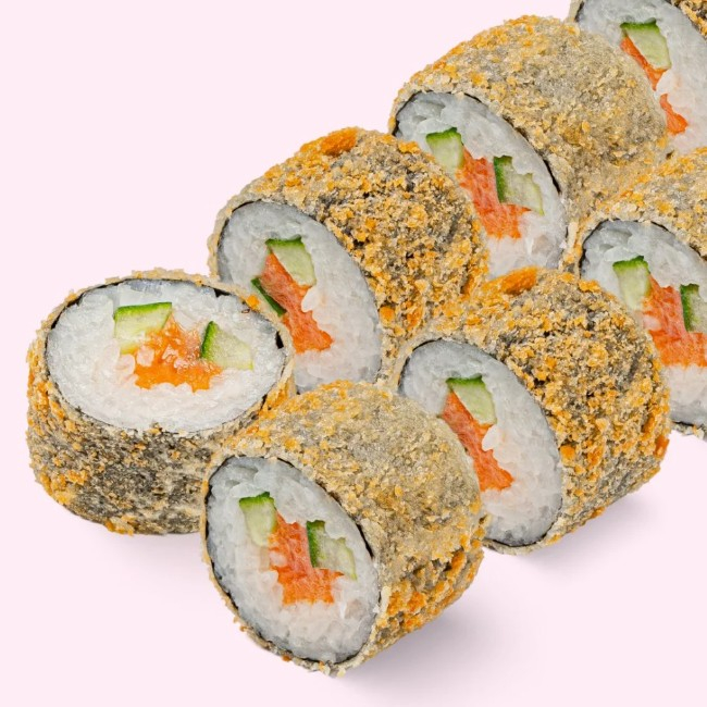 Нори, лосось, сыр сливочный, салат, кляр, сухари, соус спайс, соус унаги, соус чили-ананас.
