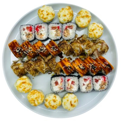 1. Ролл в лососе со сливочным сыром и манго. 2. В чукке ролл со сливочным сыром, лососем и креветкой. 3. Ролл со сливочным сыром, сурими и маринованным редисом. 4. Запеченный ролл с лососем терияки, сливочным сыром и томатом. 5. Запеченный ролл с курицей и такуаном. 6. Жаренный в темпуре ролл с тунцом, сливочным сыром, острым соусом и болгарским перцем.
