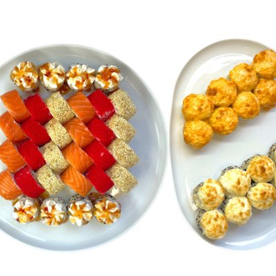 Заказать 1. В лососе со сливочным сыром и огурцом. 2. Ролл в стружке тунца с лососем, сливочным сыром и маринованным редисом. 3. Ролл в чукке с мидиями, сливочным сыром и авокадо. 4. Ролл со сливочным сыром, жаренной курицей и кисло сладким соусом. 5. Запеченный с лососем, сливочным сыром и томатом. 6. Запеченный с сурими, сливочным сыром и огурцом под чесночной шапочкой. + комплект гарниров.