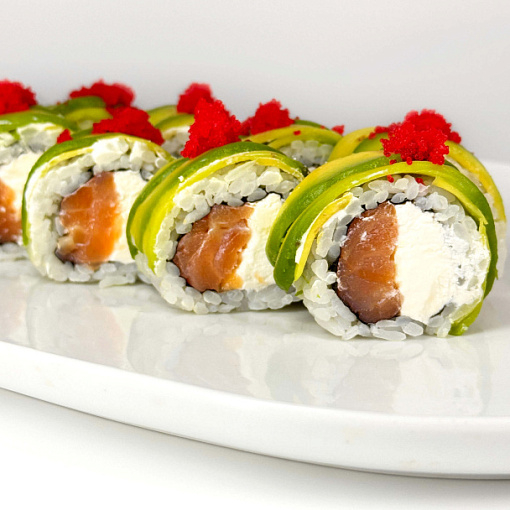 Рис, лосось слабосолёный, авокадо, икра тобико.