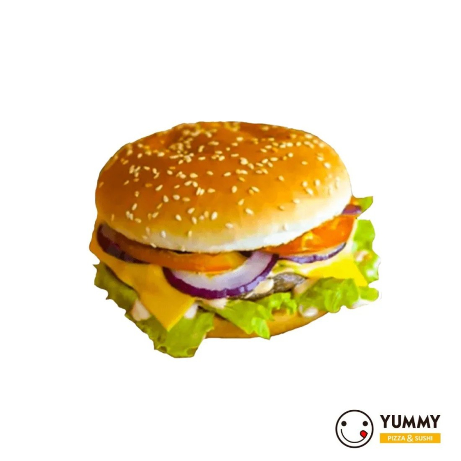 Заказать Булочка, салат Айсберг, соус, котлета говяжья, сыр, томат, огурец, горчичный соус, лук.