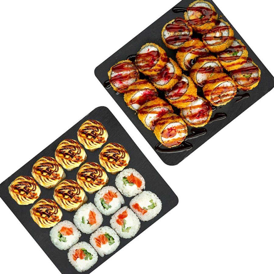 Заказать Ролл Филадельфия (лосось), ролл Сёгун терияки (лосось терияки), ролл Токио с тунцом запечённый, ролл Техас Hot, Маки с огурцом.