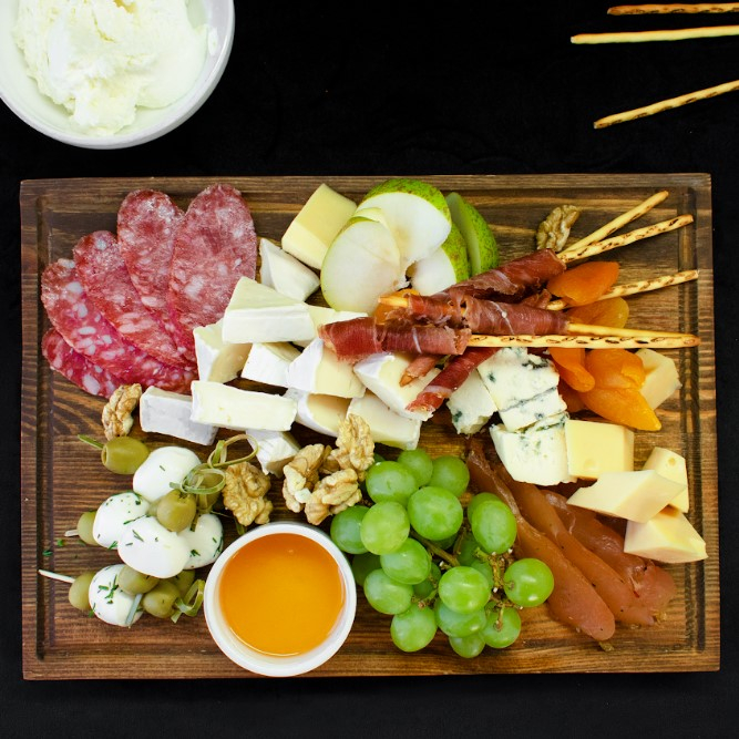 Заказать Сыр: Бри, Дорблю, Маасдам, Моцарелла, оливки, колбаса Деликатесная, виноград, груша, гриссини, филе куриное сыровяленое.