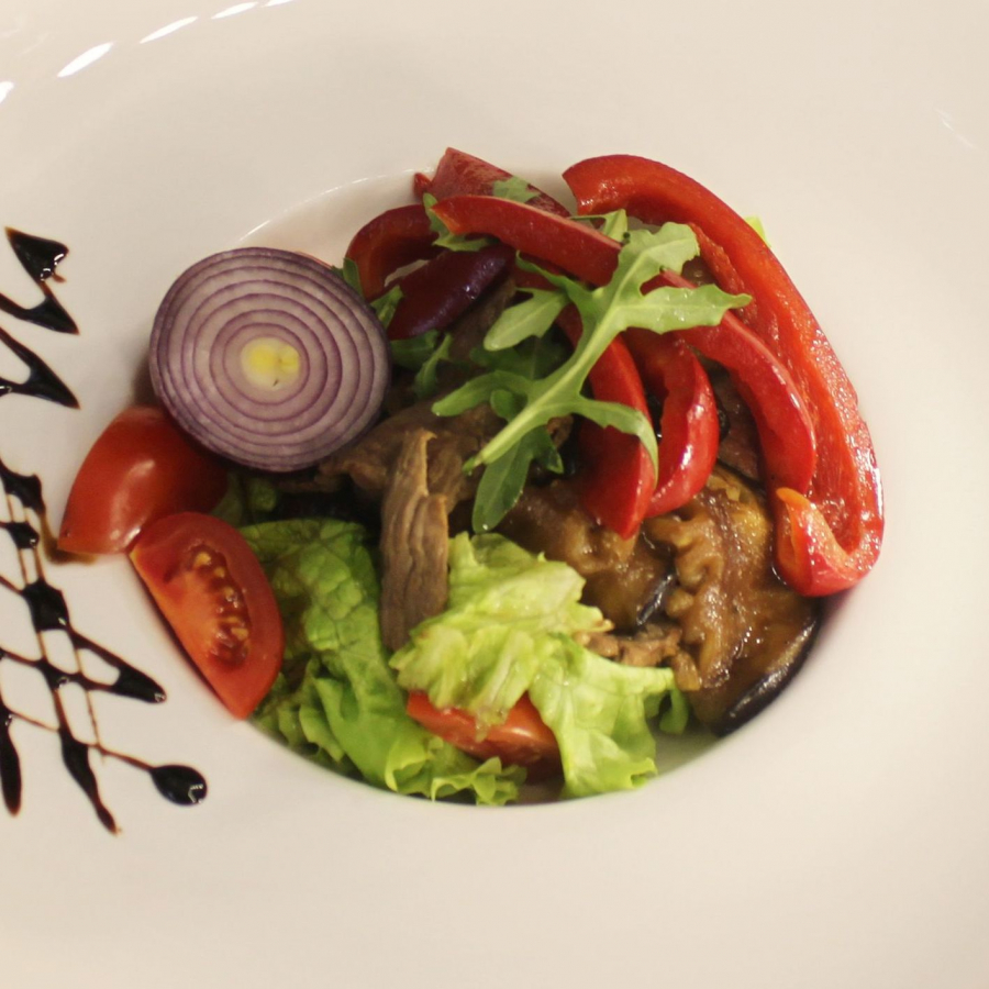 Говядина, баклажаны, перец сладкий, листья салата, синий лук, фирменная заправка.