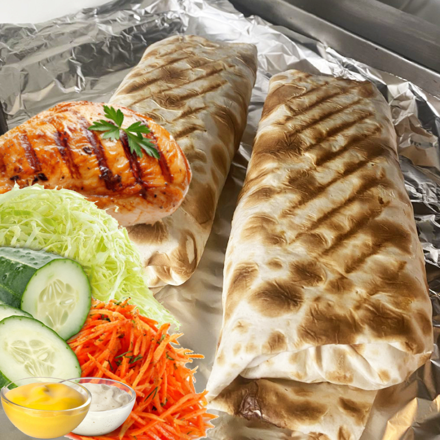 Заказать Лаваш, филе куриное гриль, капуста, огурец свежий, морковь по-корейски, соус фирменный.