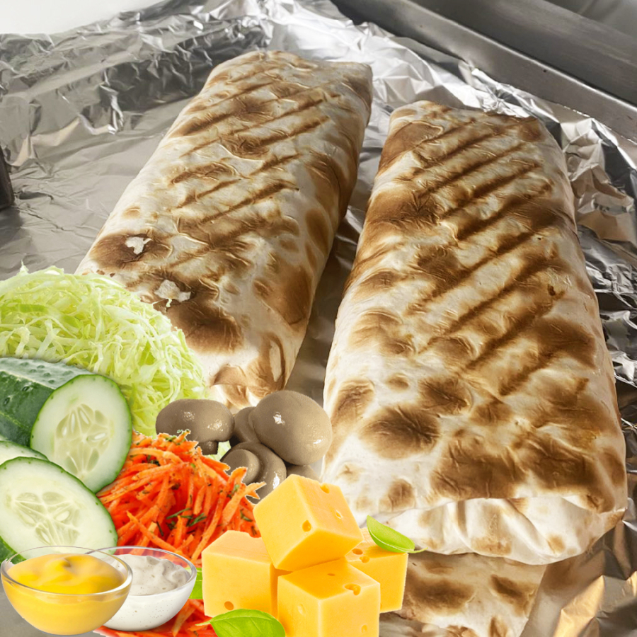 Заказать Лаваш, капуста, сыр, шампиньоны, огурец свежий, морковь по-корейски, соус фирменный.