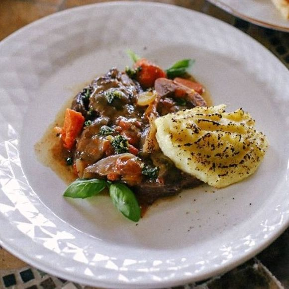 Оссобуко, крем картофельный, томаты в собственном соку, морковь, перец сладкий, лук репчатый, вино красное сухое, гремолата (цедра лимона, зелень).